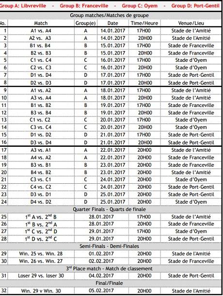 A Confederação africana de Futebol divulgou hoje os horários e os locais onde serão realizados todos os jogos do CAN 2017, com destaque para os jogos do grupo A que serão disputados em Libreville, os do grupo B em Franceville, do grupo C em Oyem e os jogos de grupo D em Port-Gentil.