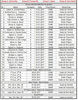 Os Djurtus terão a honra de jogar a partida inaugural frente a seleção anfitriã GABÃO no dia 14 de Jnairo de 2017 pelas 17 horas no estádio L´Amitié de Libreville, já o seu segundo jogo será no dia 18 de Janeiro no mesmo estádio pelas 20h:00 frente a seleção Camaronesa e no dia 22 de Janeiro fará o seu último jogo na fase de grupos frente a seleção Burquinabe quando forem 20 horas no estádio de Franceville.