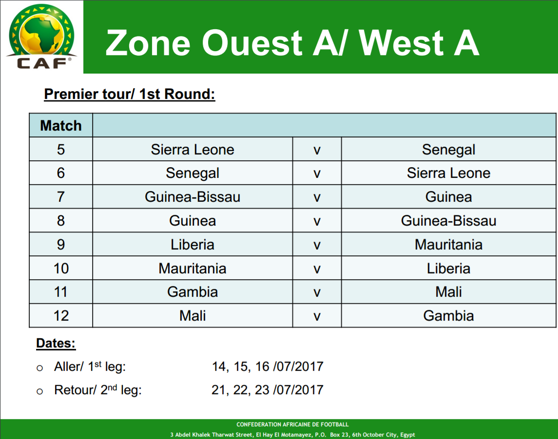Caso a Seleção Nacional apurar para a fase seguinte, terá a frente como adversário, Senegal ou Serra-Leoa que se defrontam na primeira eliminatória.Os jogos da segunda eliminatória estão marcados para o mês de Agosto, sendo a primeira mão a disputar entre 11, 12, 13 de Agosto de 2017 e a segunda mão para numa data a marcar entre 18, 19, e 20 de Agosto do corrente ano.