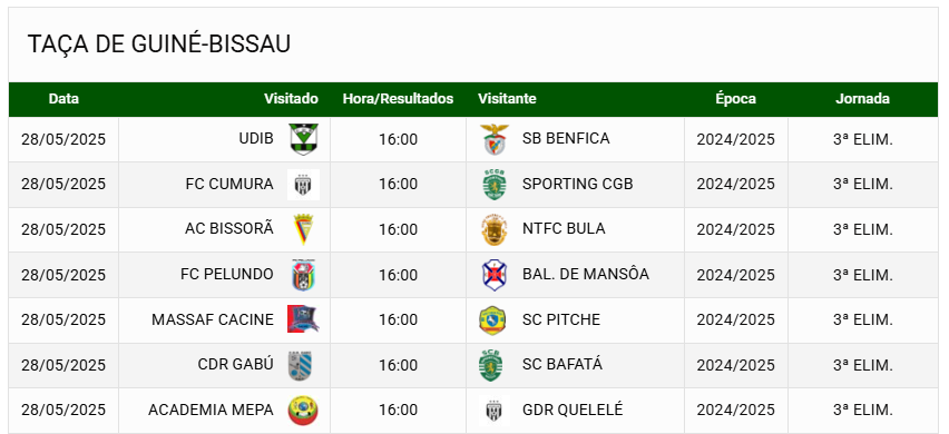 A Federação de Futebol da Guiné-Bissau agendou para esta quarta-feira (28-05), todos os jogos da terceira eliminatória da Taça de Guiné, prova rainha nacional.